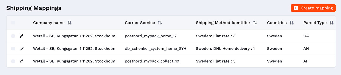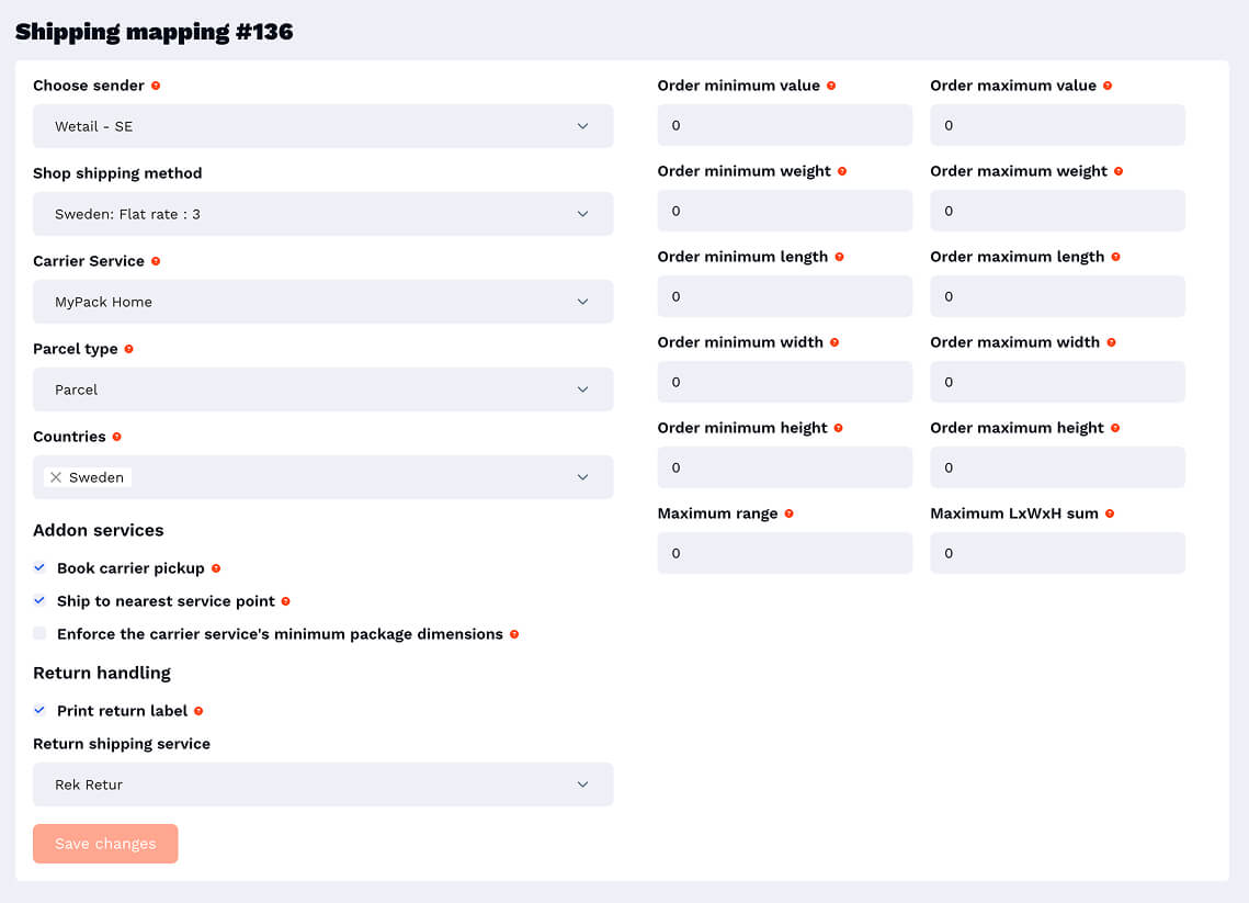 2. Här mappar du upp din butiks fraktsätt med en transportörs fraktmetoder. Du kan även ange avanacerade inställningar i din mappning som min/max vikt, dimensioner o.s.v.