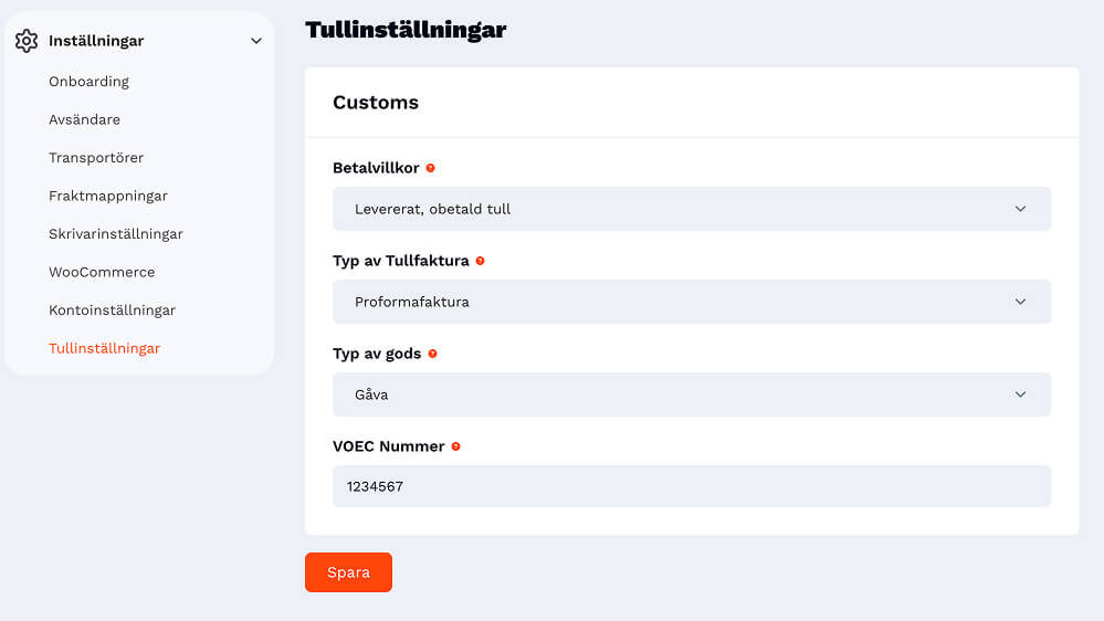 Ange Betalvillkor, typ av tulllfaktura samt typ av gods. Om ni ska frakta till Norge krävs ett VOEC-nummer. När du väljer betalvillkor för tull kan du ange hur tullkostnaderna ska hanteras vid leverans: