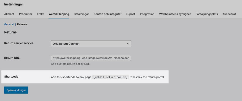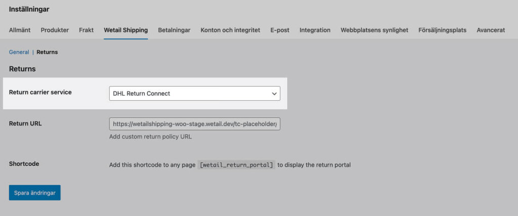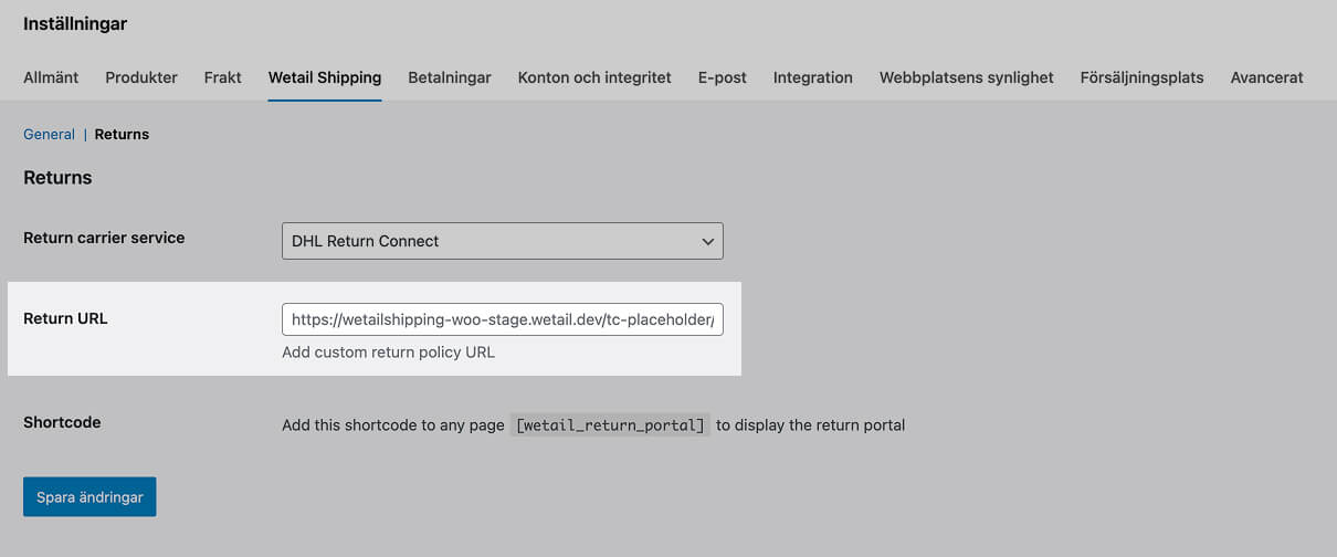 Vill man eventuellt använda en annan sida för er returpolicy så navigerar man till WooCommerce > Inställningar > Wetail Shipping > Returer > Return URL och klistrar in länken till den sidan du vill länka till.